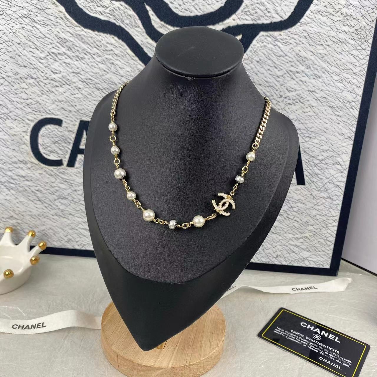 CHANE1 ダブルC ホワイトレター オイルドロップエナメルパールネックレス【50%割引+送料無料】