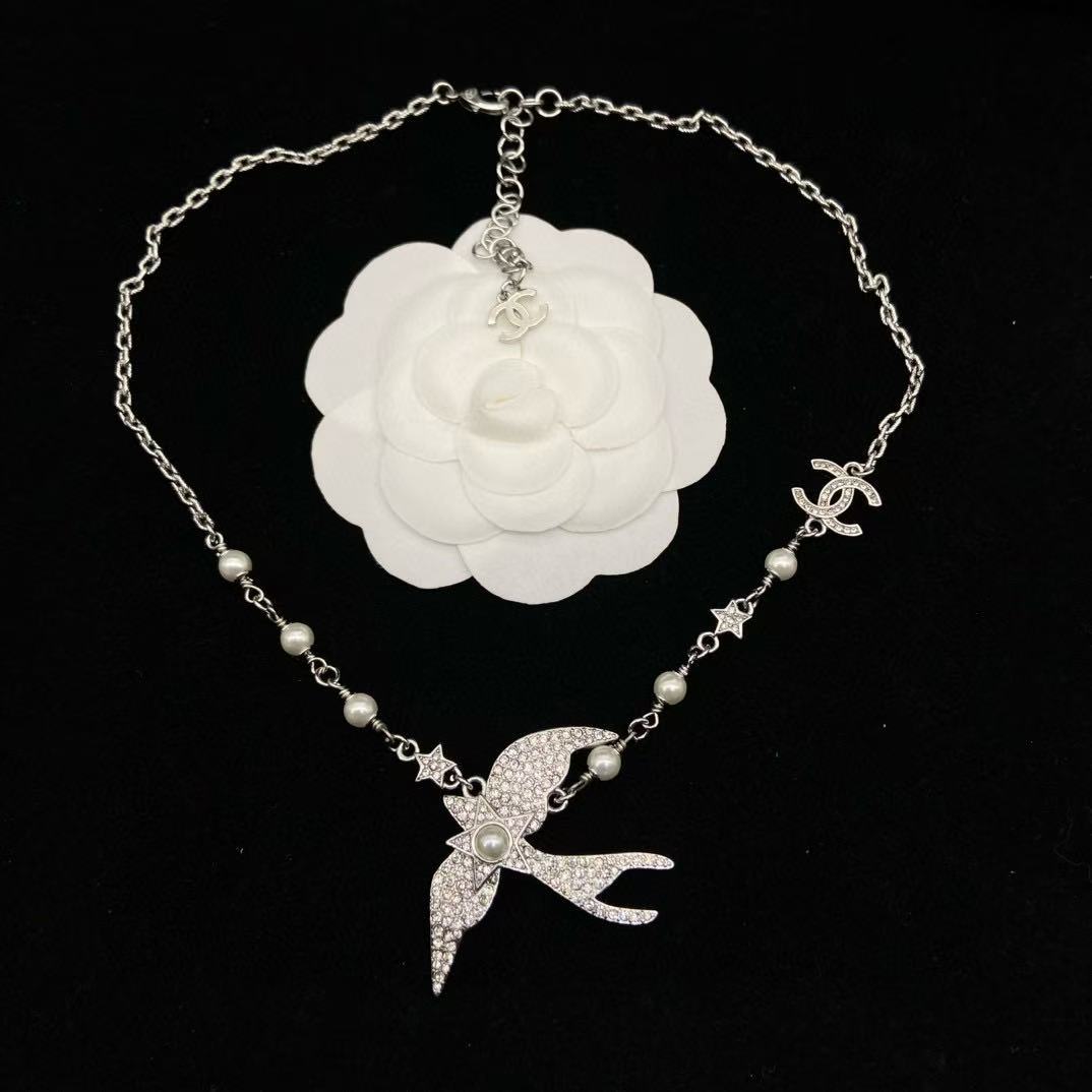 CHANE1 フルダイヤモンド ダブルC バードパールネックレス【50%割引+送料無料】