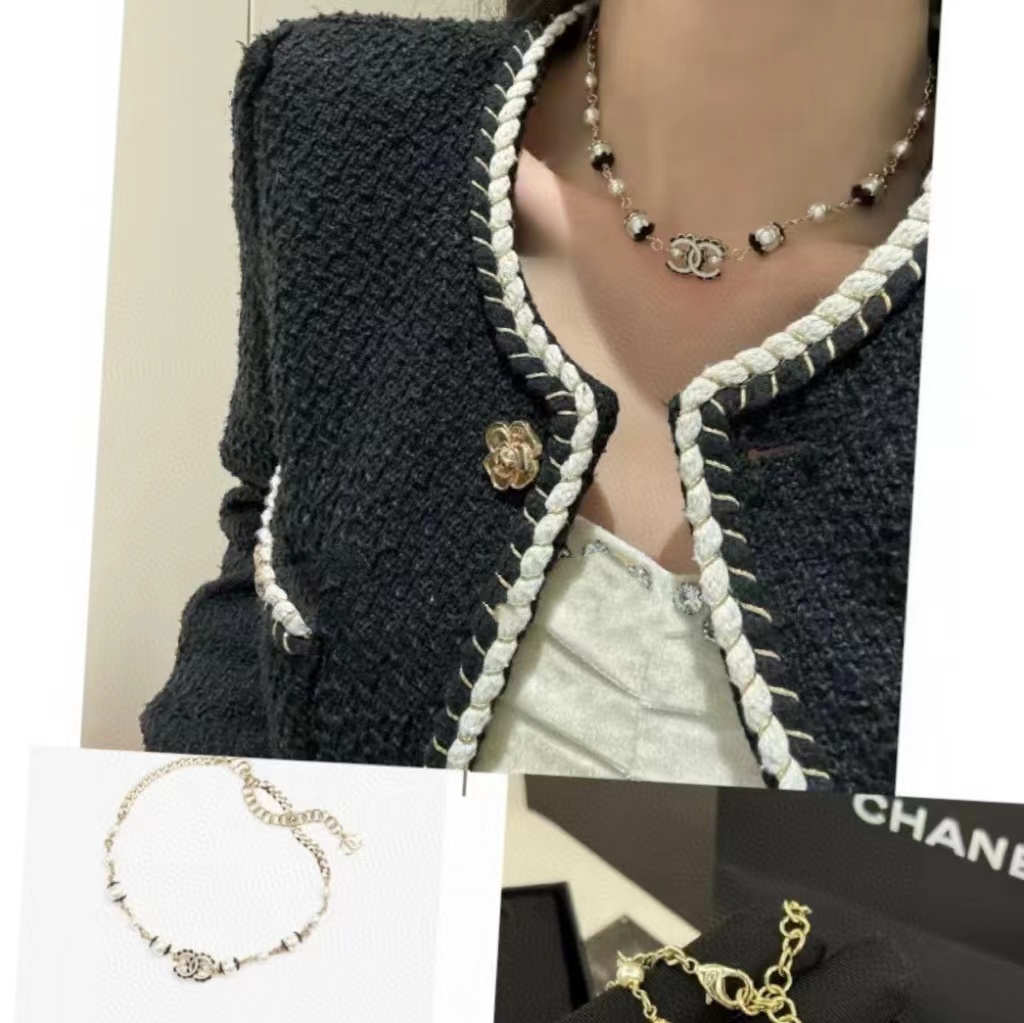 CHANE1 黒白ダブルCレター オイルドロップエナメルパールネックレス【50%割引+送料無料】