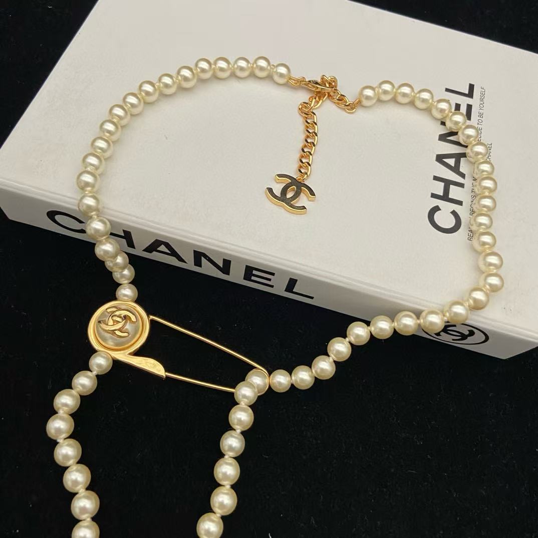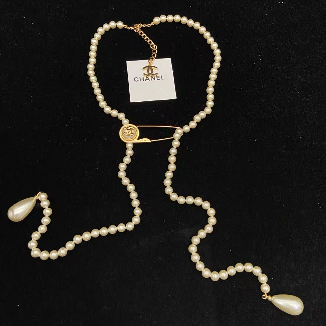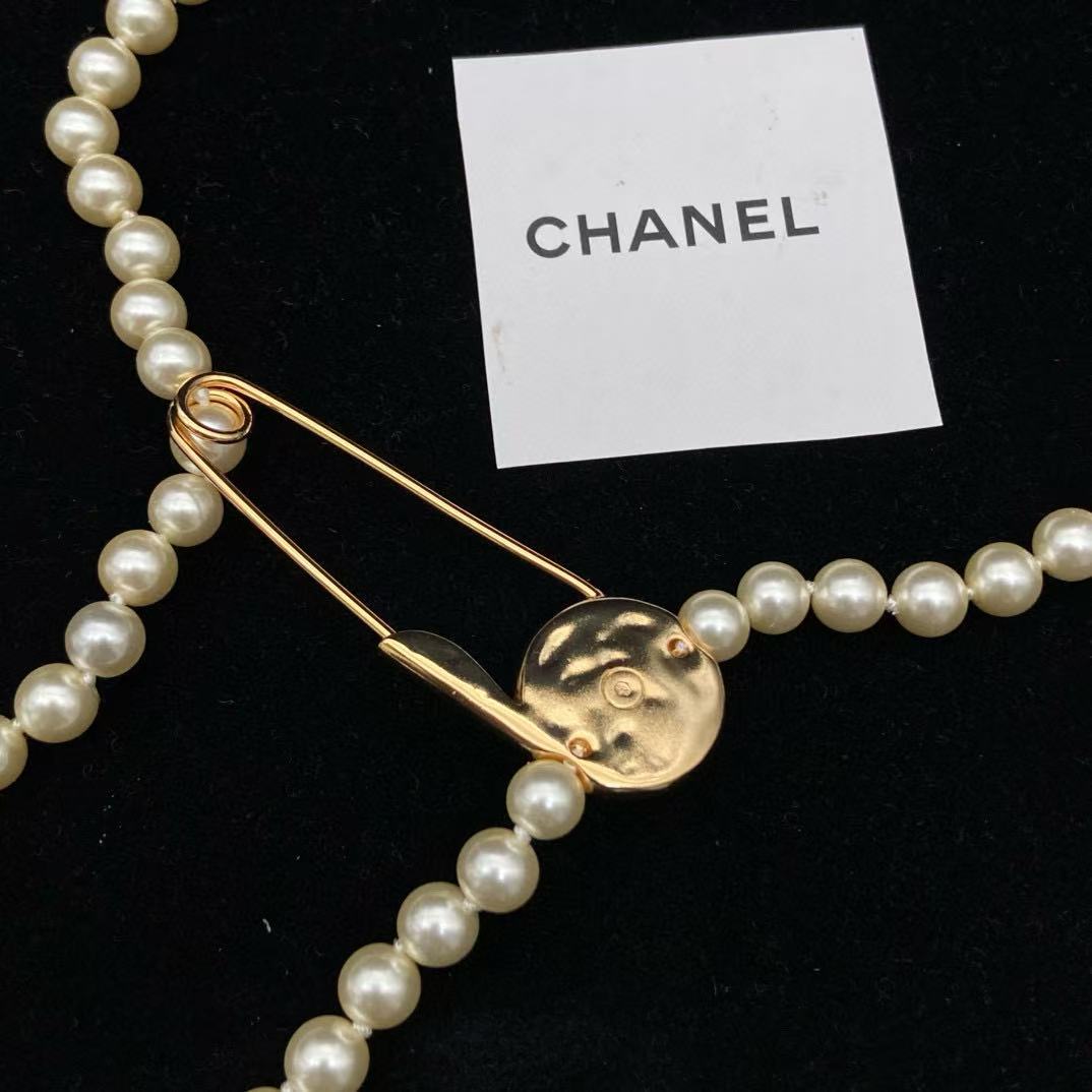 CHANE1 ダブルCパールボタンピンセーターネックレス