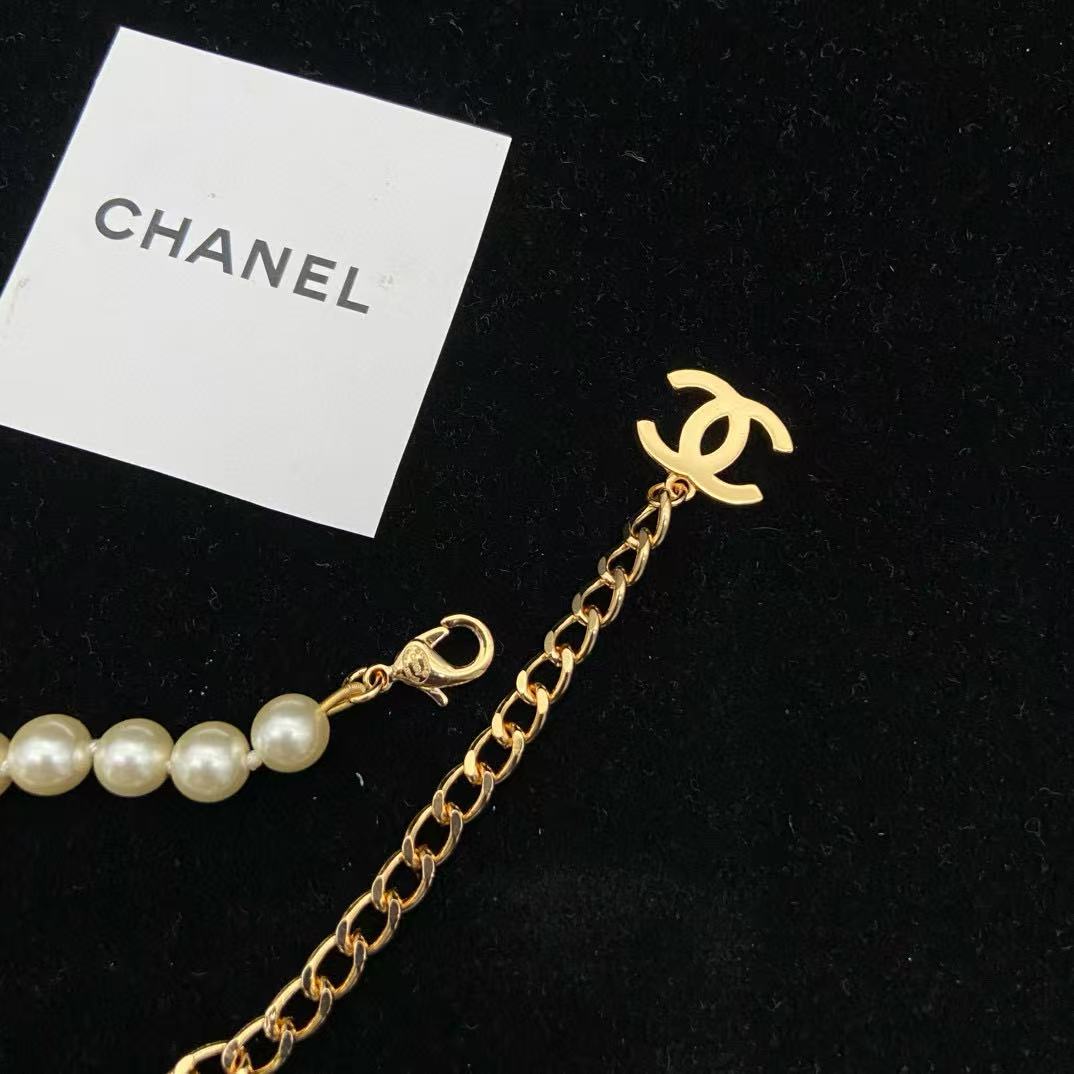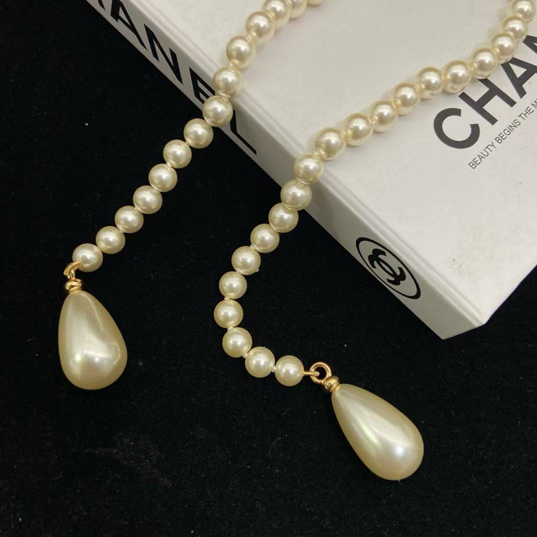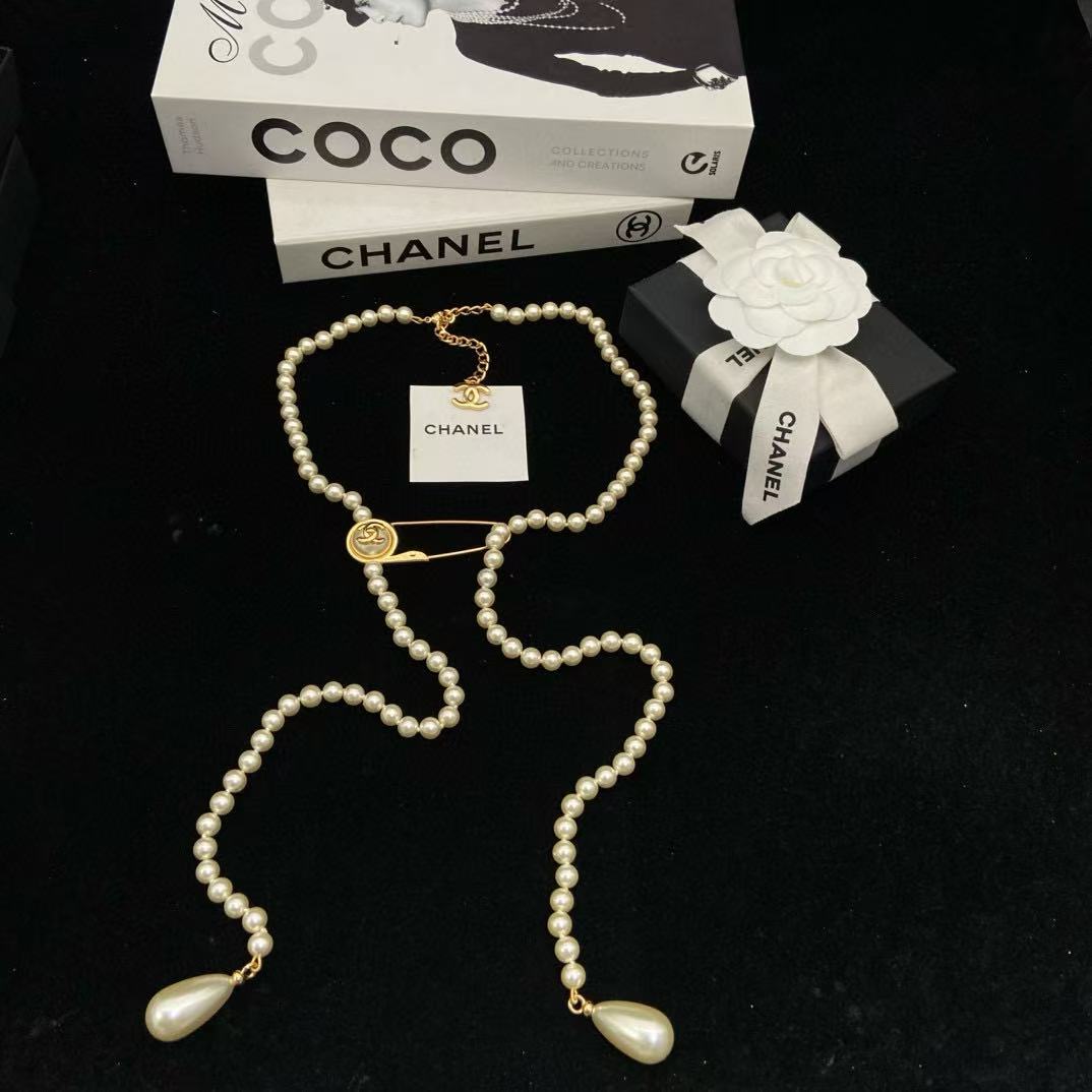 CHANE1 ダブルCパールボタンピンセーターネックレス